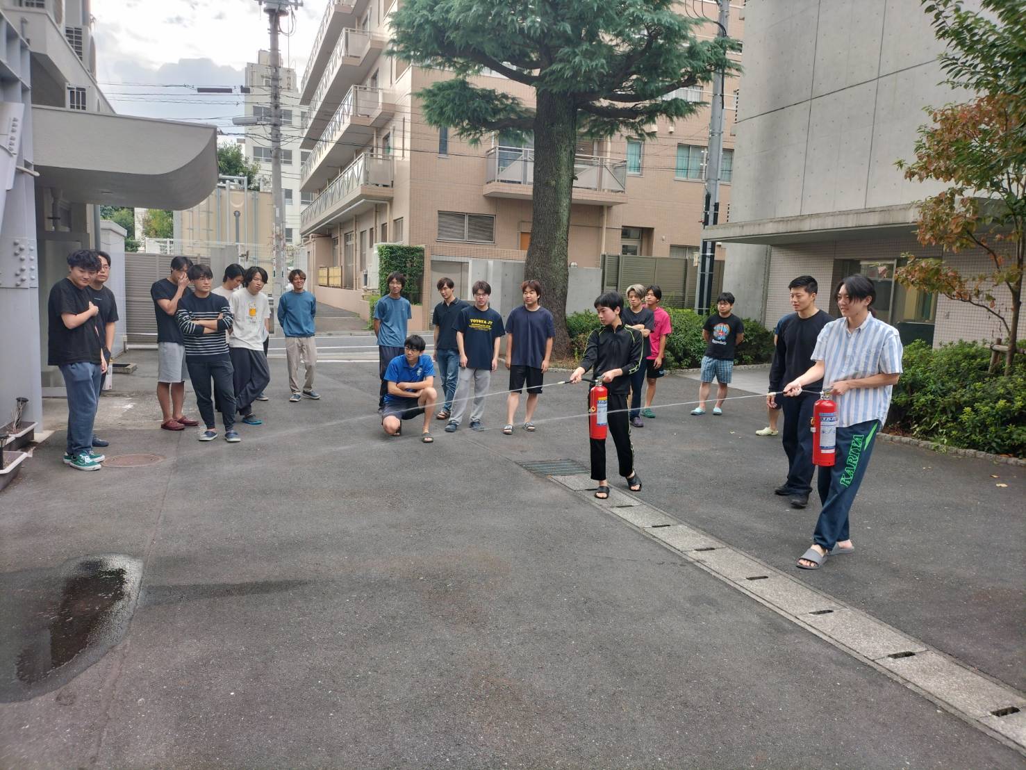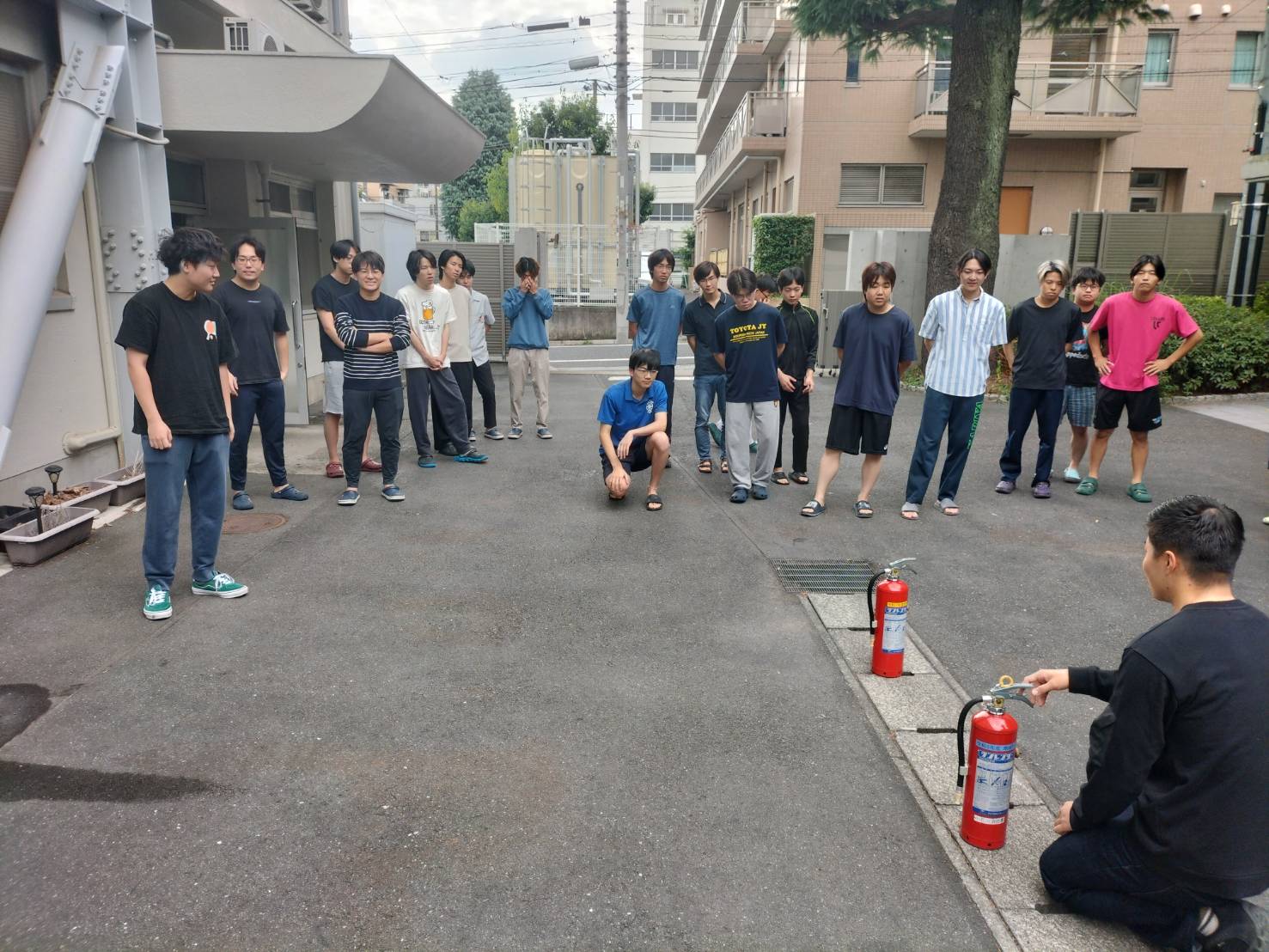 今年も例年通り「避難訓練」「消火訓練」「通報訓練」といった内容での実施となりましたが、今回は、今年消防関係の仕事に就いたOBの山本くんをゲストに迎えました。