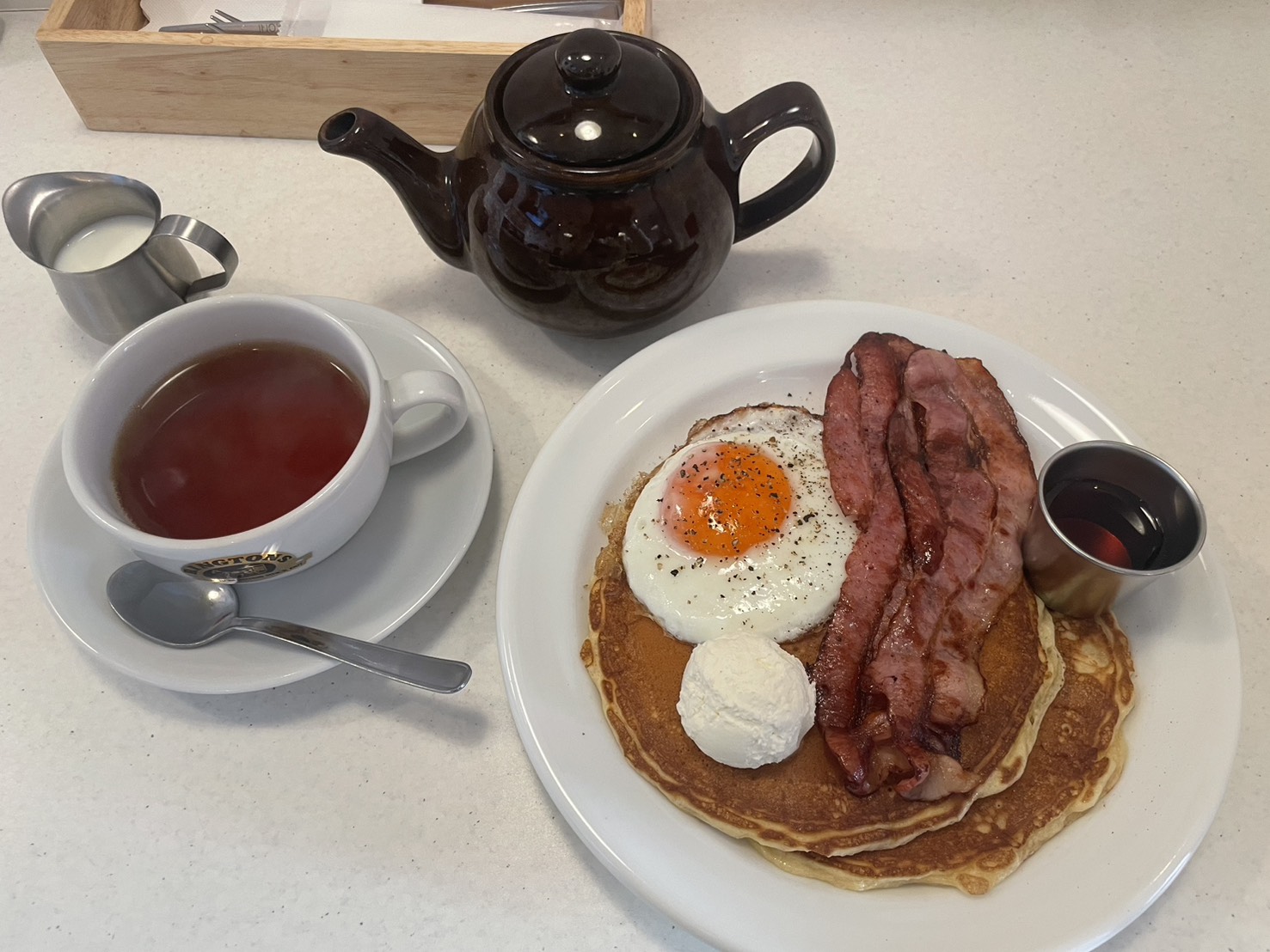 私はお目当てのベーコンエッグバターミルクパンケーキとヨークシャーティーを注文しました。